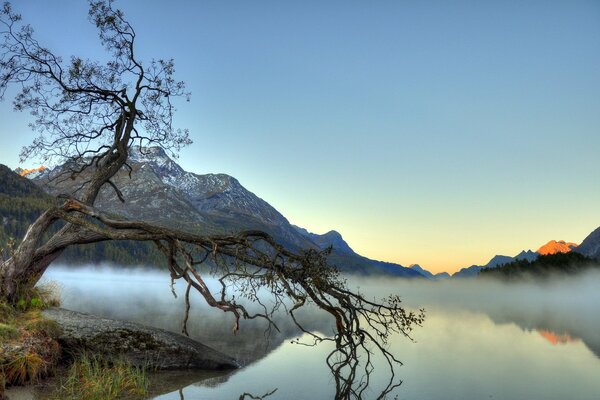 sky tree river lake reflection fog sunset horizon clouds1920 x 1272, 354 kB