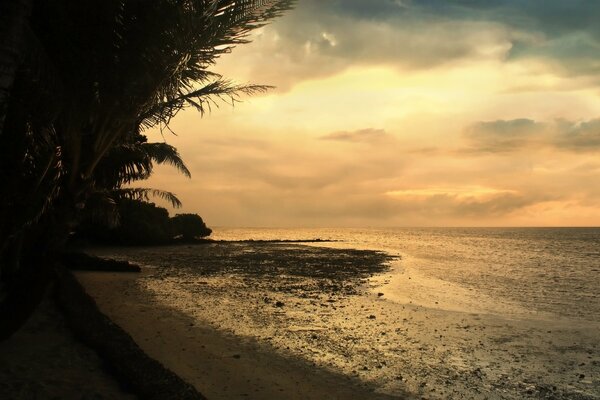 coast tree palma sand stones waves beach sea ocean horizon sky clouds sunset1920 x 1080, 446 kB
