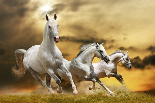 Three white horses run against the orange sky1920 x 1369, 367 kB