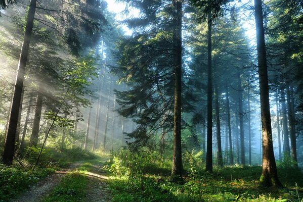 forest trail path tree spruce fog autumn nature
