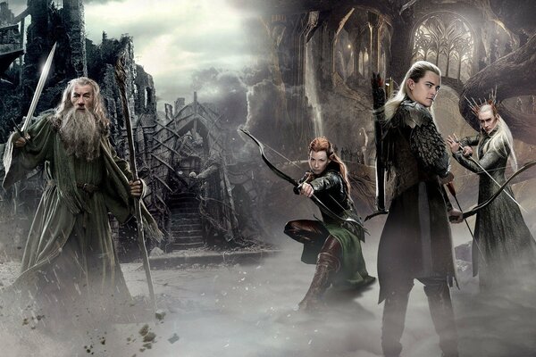 the hobbit the desolation of smaug 2nd movie gandalf elf bow protectors of middle earth archer archery mage white mage sword debris mist middle earth sky j.r.r. tolkien clouds staff the lord of the ri