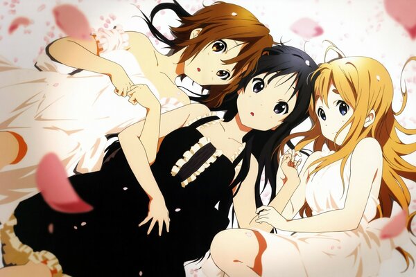 blue eyes short hair brown eyes petals blonde hair kotobuki tsumugi black hair long hair dress 3girls black eyes brown hair1920 x 1200, 338 kB