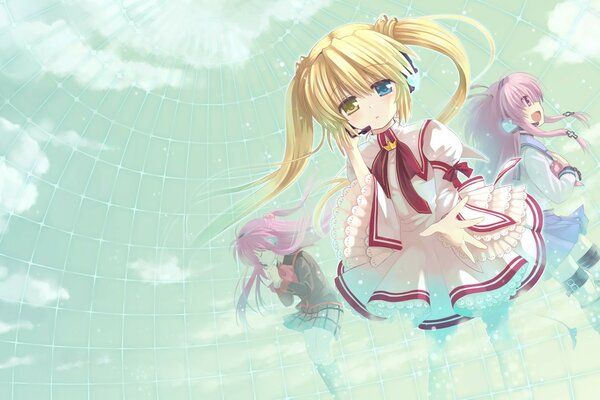 red hair sky tapes seifuku drinking short hair torment clouds black hair long hair fruits blush 3girls food blue hair1920 x 1200, 434 kB