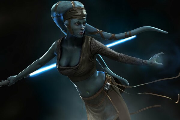 A blue woman, with a tentacle for hair, holds a lightsaber