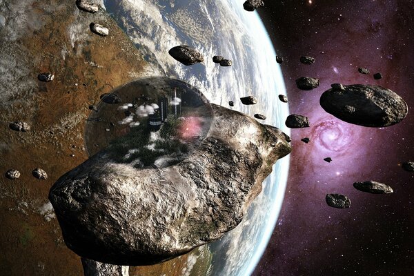 a world view scott richard space spiral galaxy stars planet asteroid belt asteroid city towers buildings air dome closed ecosphere clouds forest an asteroid town tower closed