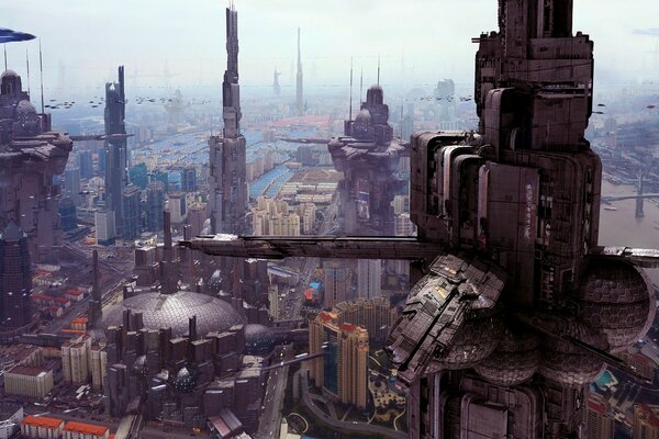 futuristic city 6 scott richard megalopolis future sci-fi fantasy buildings skyscrapers spiers towers sky clouds aircars town metropolis fiction tower aircar machinery airway