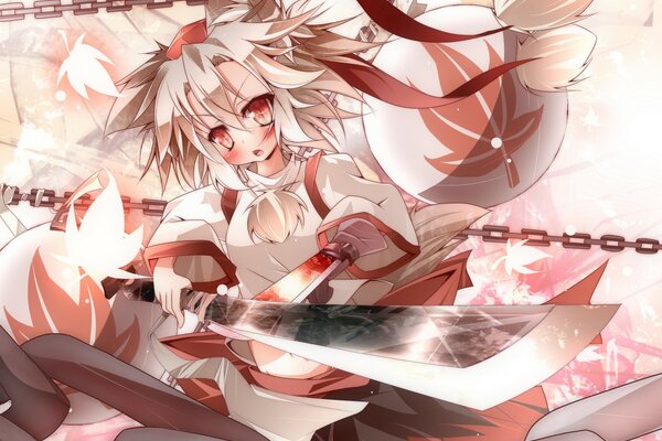 short hair hat white hair inubashiri momiji sheet chains red eyes blush weapon animal ears sword1920 x 1440, 502 kB