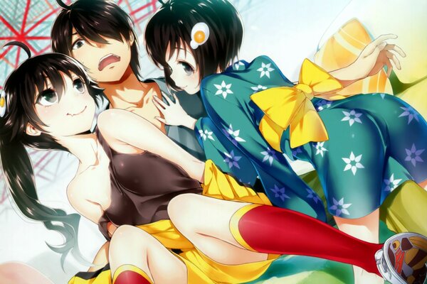 seifuku kimono red red eyes hanekawa tsubasa japanese clothes araragi koyomi senjougahara hitagi catgirl araragi tsukihi animal ears sengoku nadeko1633 x 1200, 393 kB