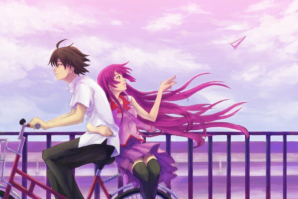 bakemonogatari senjougahara hitagi araragi koyomi girl long hair short hair brown hair men pink hair sky ahoge section jacket hug wind bike1920 x 1358, 281 kB