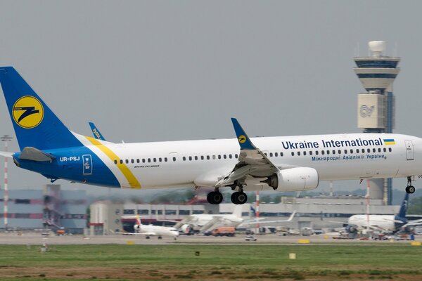 The plane of Ukraine is landing at the airport