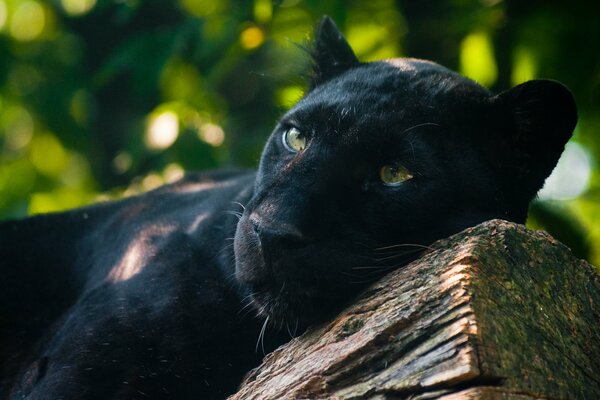 Black panther head lying on a tree