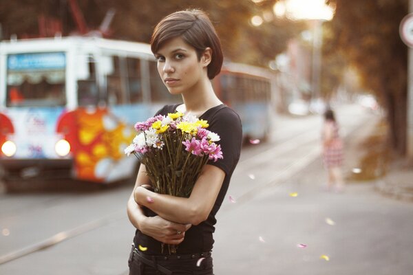 girl bouquet flower brown hair brown-eyed view the tram town petals1920 x 1250, 253 kB