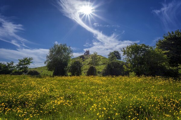 burrow mump burrowbridge somerset england barroubridzh hill meadow flower buttercups tree sky clouds