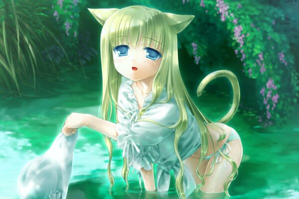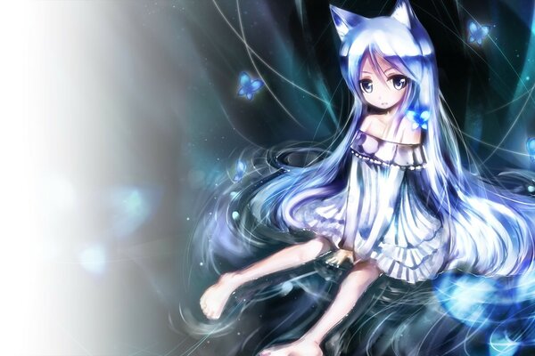 blue eyes light barefoot white hair catgirl long hair water dress animal ears
