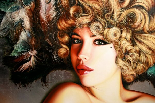 christiane vleugels girl art face the mole lips view green eyes blonde curls hair feathers shoulders1920 x 1550, 626 kB