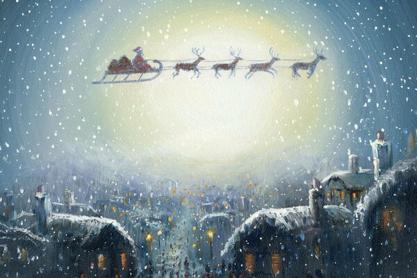Santa Claus in a sleigh with reindeer on Christmas Eve flies over the snow-covered roofs of a sleeping city1920 x 1080, 543 kB