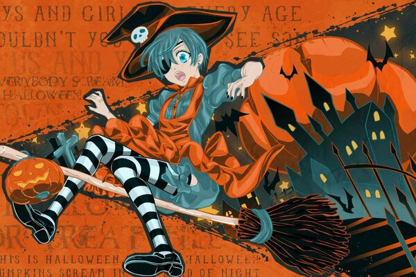 kuroshitsuji halloween ciel phantomhive broom pumpkin volatile mouse hat skull fear striped stockings cross castle apron1920 x 1176, 358 kB