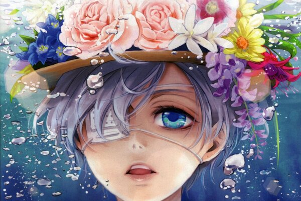art anime kuroshitsuji dark butler ciel phantomhive guy hat bandage flower under water bubbles roses1920 x 1636, 661 kB