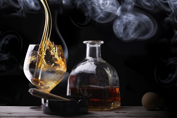 table glass a bottle brandy cigar smoke