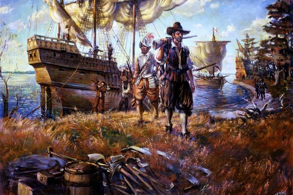 mouth chesapeake gulf ships beach english .first colonists jamestown pattern canvas oil1920 x 1338, 725 kB
