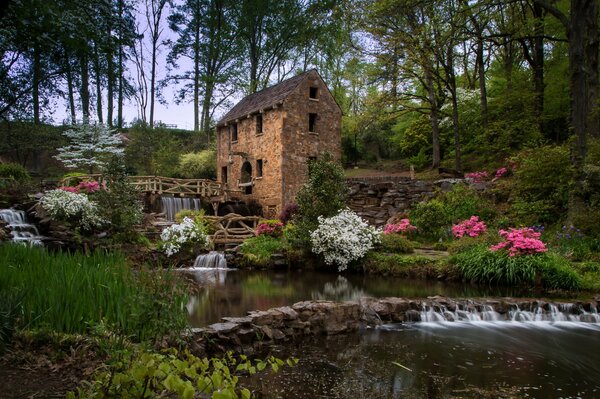 forest bush tree creek stones waterfall water mill1920 x 1202, 691 kB