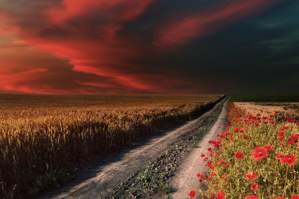 sky the field road poppies