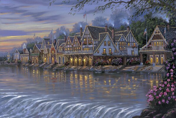 pattern robert finale houses of the tube smoke river water rapids boat beach flower lights reflection flags night