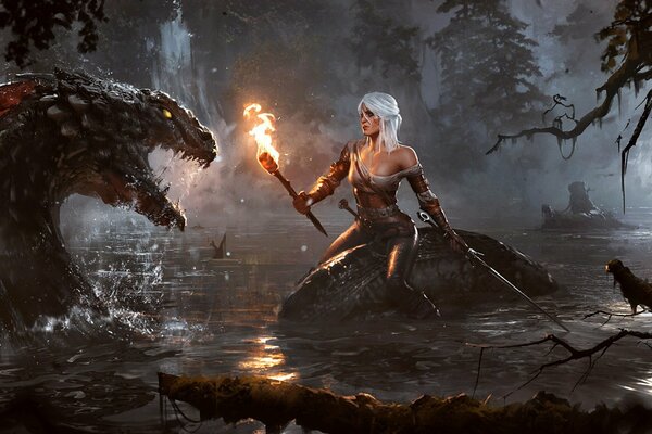 witcher lion cub of cintra cirilla fiona elen riannon ciri the witcher 3: wild hunt monster lake water torch a woman sword night