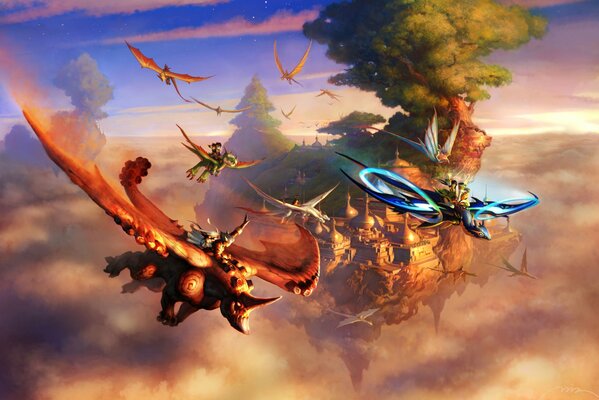 art fantasy being flight in the sky town flying tree rock dragons rhinoceros riders riding clouds1920 x 1358, 309 kB