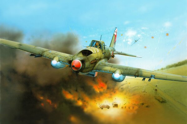 art plane il -2m soviet attack column german avtobronetehnika explosions fire smoke bob picture