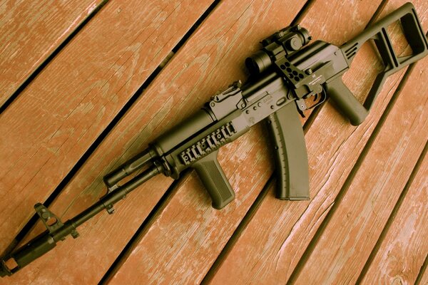 The rifle is green on the wooden floor