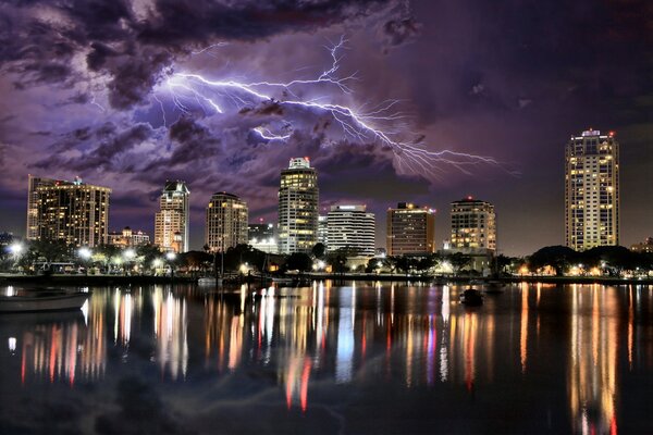 clouds night reflection town the storm sky lightning