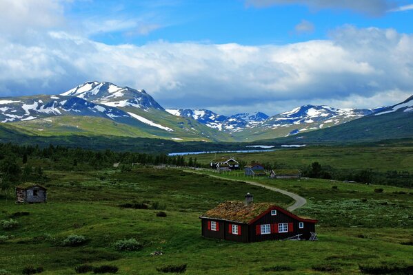 norway mountain house grass sky clouds2133 x 1200, 863 kB