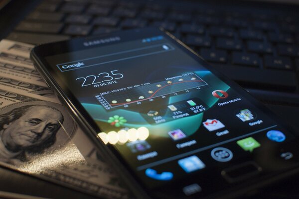 Samsung smartphone is on the laptop keyboard with dollars1953 x 1200, 270 kB