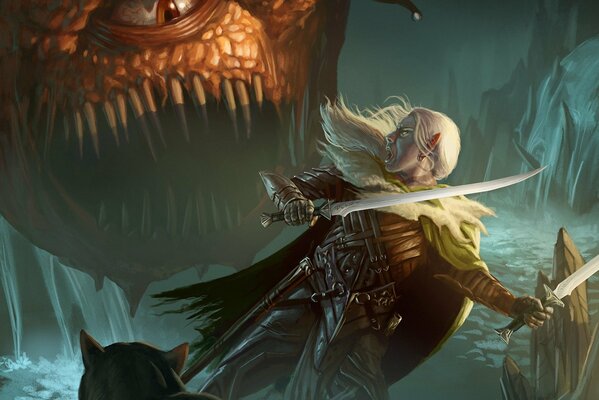 illustration to the book saber robert salvatore dark elf drizzt drizzt do'urden forgotten realms elf monster battle gvenvivar