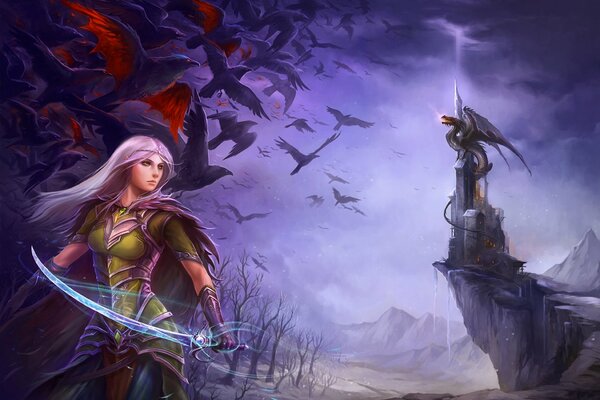 illustration to the book the nightmares of winter girl dragon sword weapon castle birds elf