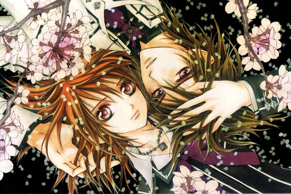 vampire-knight knight vampire girl guy kuran yuuki cross kaname kuran vampire vampires flower sakura petals view touch smile hair students form1920 x 1200, 471 kB