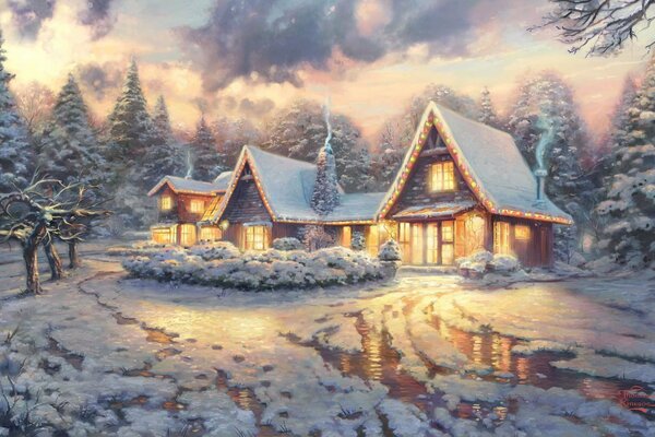 christmas lodge art film movie thomas kinkade thomas kinkade presents house winter snow ice cottage painting new pattern christmas house houses light smoke clouds of the same name