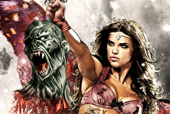 warrior girl beautiful severed head of a monster fangs krovischa firm breasts dragon tattoo picture adriana lima