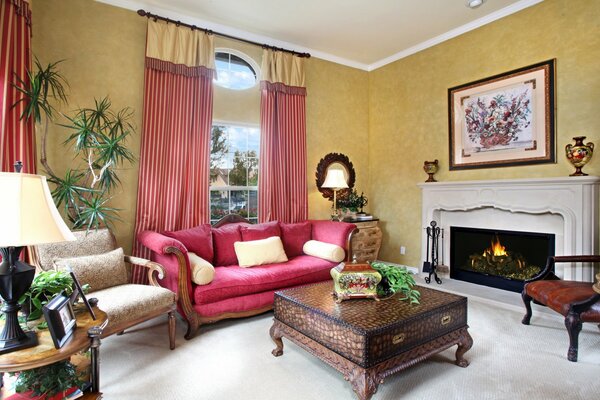 room tourists furniture leather sofa chair pattern fireplace vase flower plants curtains1920 x 1200, 443 kB