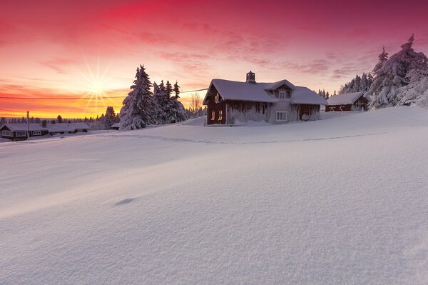 landscape nature winter snow dawn sun house beauty lillehammer norway