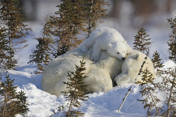 A little bear cub is sitting on a polar bear1920 x 1080, 541 kB