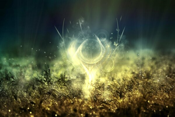 A shining transparent blue butterfly hovers over colored threads