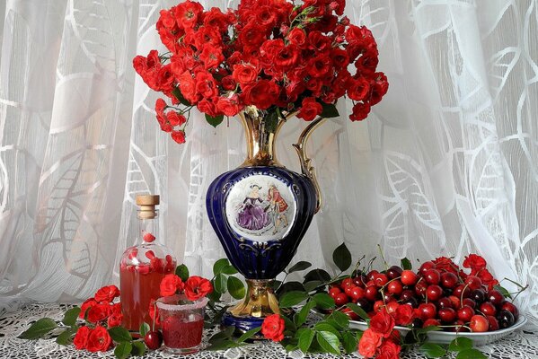 flower roses berries cherry infusion napkin tulle vase still life1920 x 1464, 860 kB