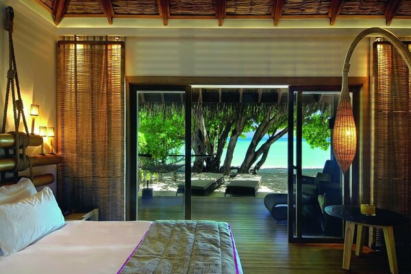 bed constance room maldives moofushi resort beautiful view beach interior tree