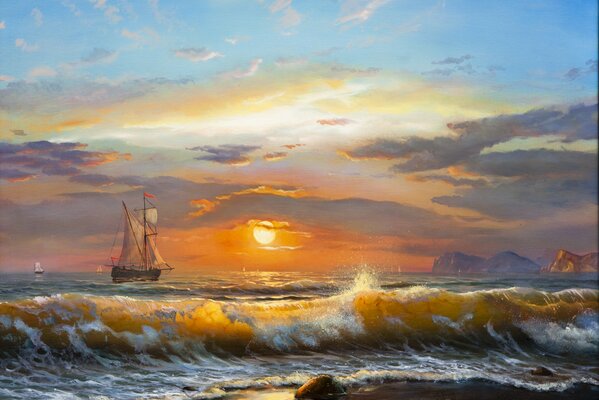 oil painting sailboat sea waves sunlight sunset landscape sky clouds sailboats1920 x 1356, 395 kB
