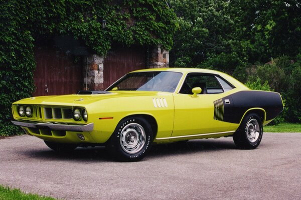 plymouth cuda hemi 1971 yellow black muscle car where a side view bush fencing gates1920 x 1440, 523 kB