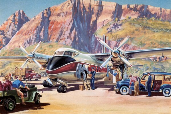art painting picture mountain airport plane podgotavka to flight.