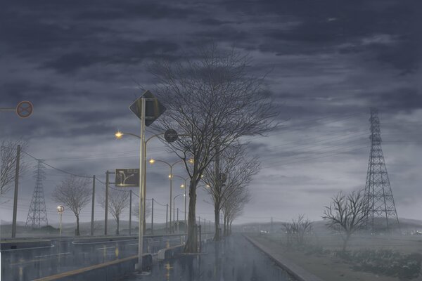 Night track in rainy weather against the background of power poles