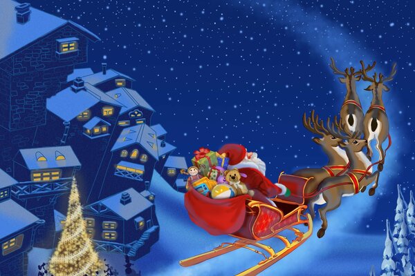 santa claus is coming merry christmas christmas tree new year snow house reindeer santa sleigh gifts toys1920 x 1427, 342 kB